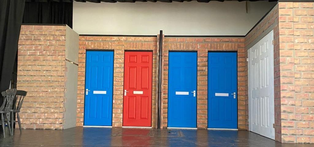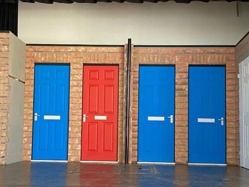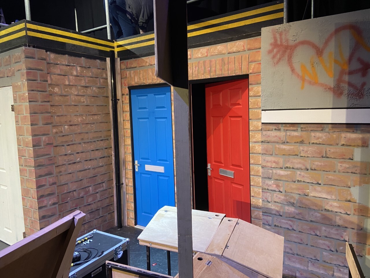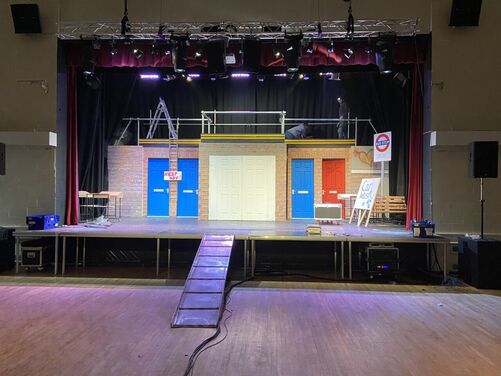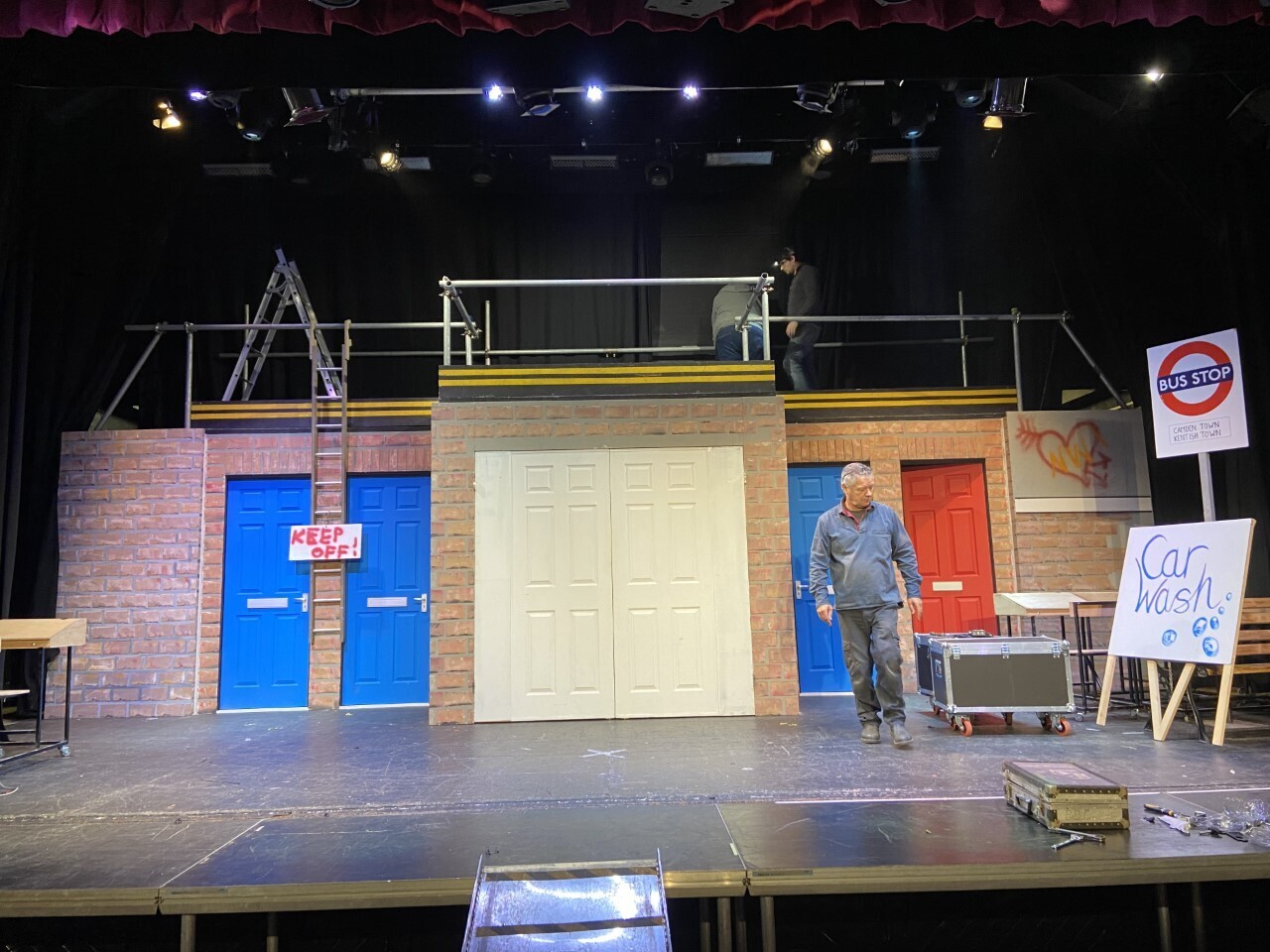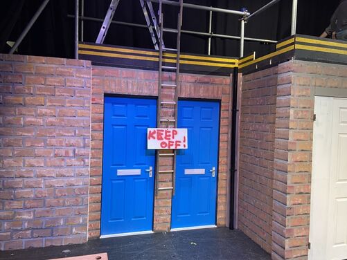 The "Our House" Set comprises of a full street scene, with large double doors centre stage housing the car behind, and four practical front doors. With its construction comprising of four 8' x 4' steel decks enabling a raised playing area of 7.2m by 4.8m at its widest point in the centre and approximately 2.5m deep - with access treads both stage left and stage right in its largest configuration.