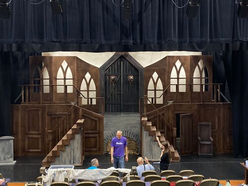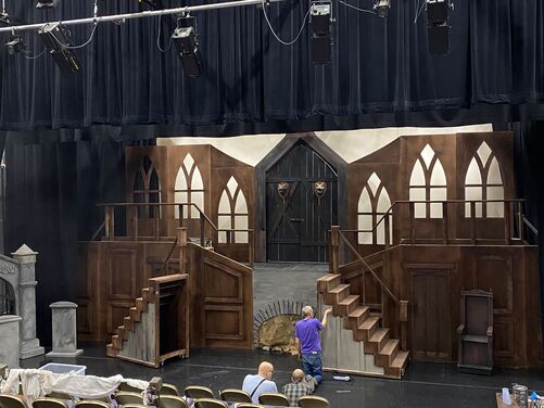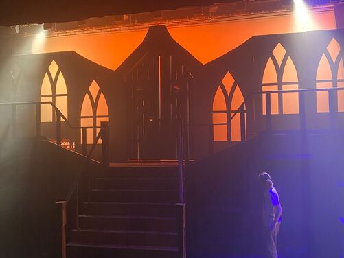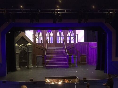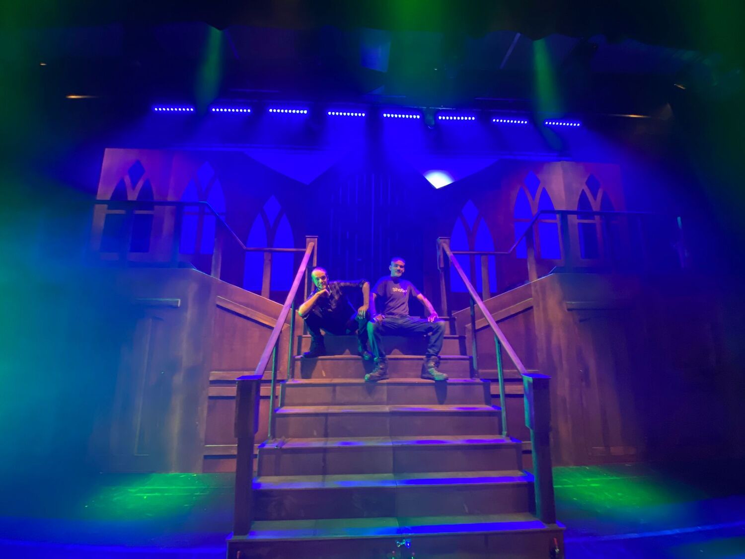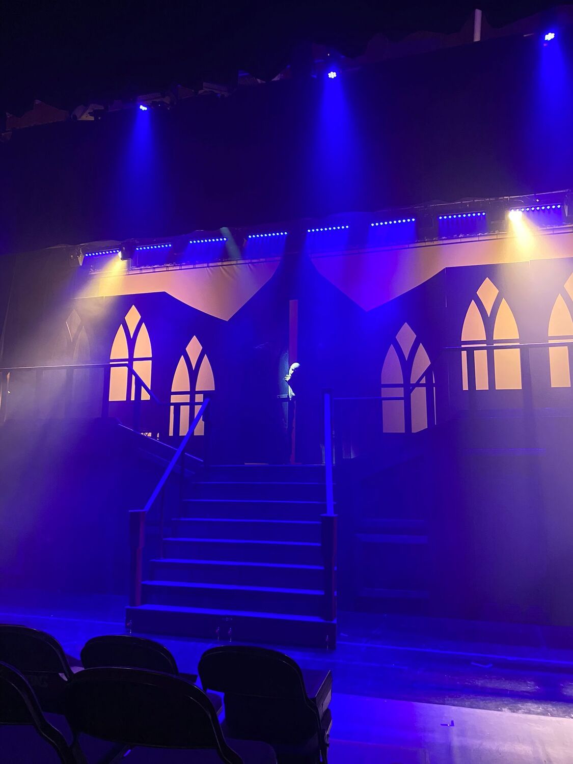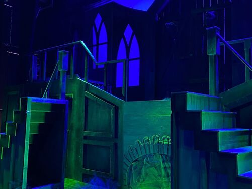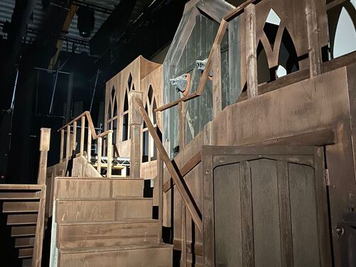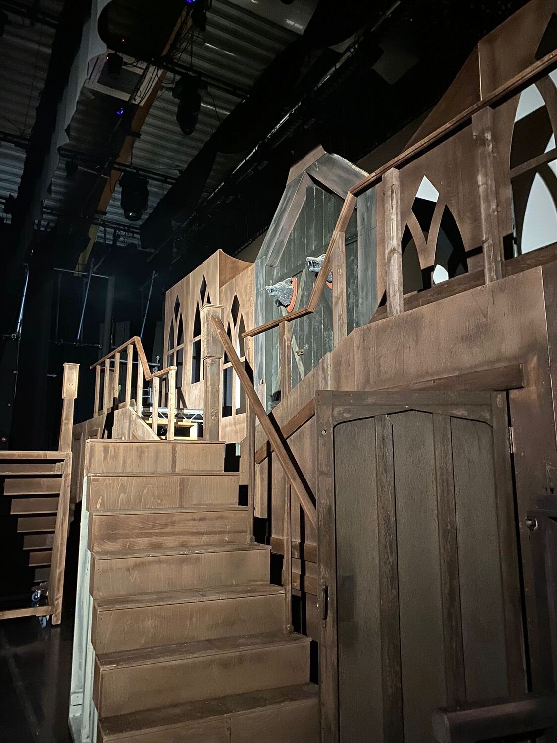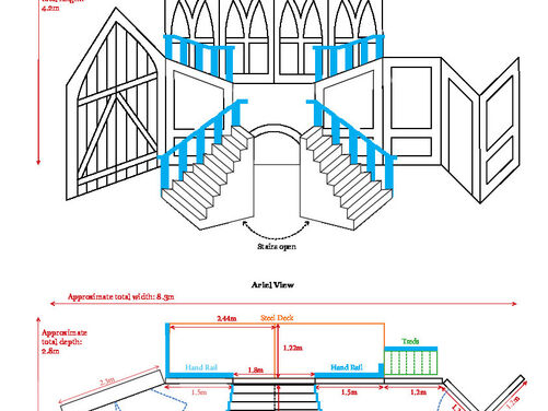 Each half standing at 1.8m, with its widest point at 1.2m and a depth of 1.64m with 8 steps and bannister each side. These stairs are fully mobile on castors, with a braking system to ensure a steady working platform, splitting down the centre to make for easy scene transitions to the torture chamber.